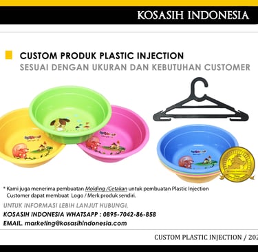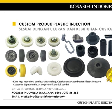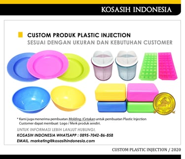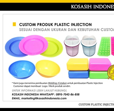 PT Kosasih Indonesia menawarkan layanan Custom Plastic Injection yang dirancang khusus untuk memenuhi kebutuhan spesifik pelanggan. Dengan teknologi canggih dan tim ahli, kami memastikan setiap produk plastik yang dihasilkan memiliki presisi tinggi dan kualitas terbaik. Mulai dari pembuatan molding/cetakan hingga produk jadi, kami siap membantu Anda mewujudkan desain menjadi kenyataan. Pelanggan juga dapat menambahkan logo atau merek mereka sendiri pada produk. Dengan harga yang kompetitif, kami memberikan solusi terbaik untuk berbagai kebutuhan industri. Percayakan kebutuhan plastik custom Anda pada kami, dan dapatkan hasil yang memuaskan hanya di PT Kosasih Indonesia!